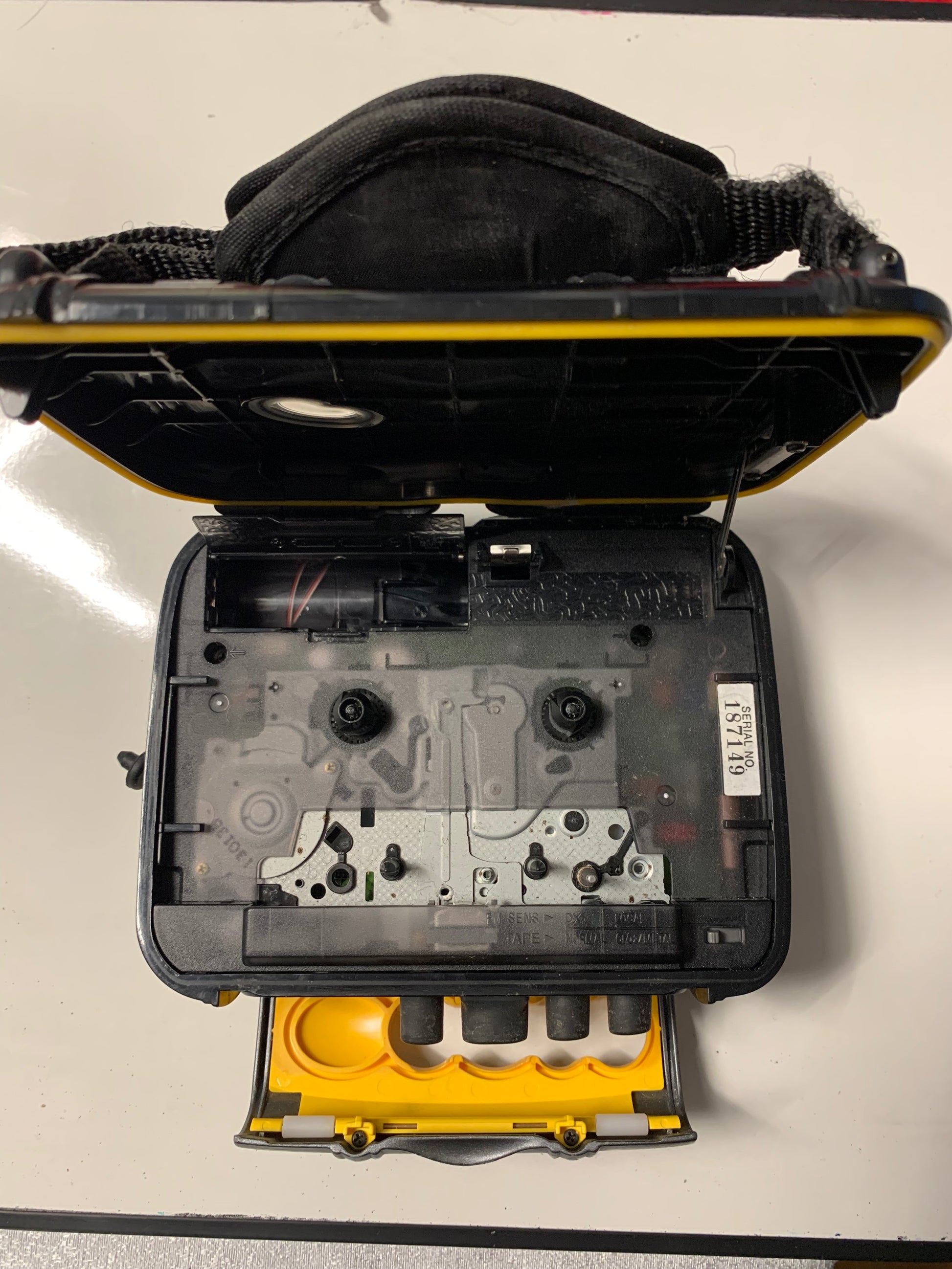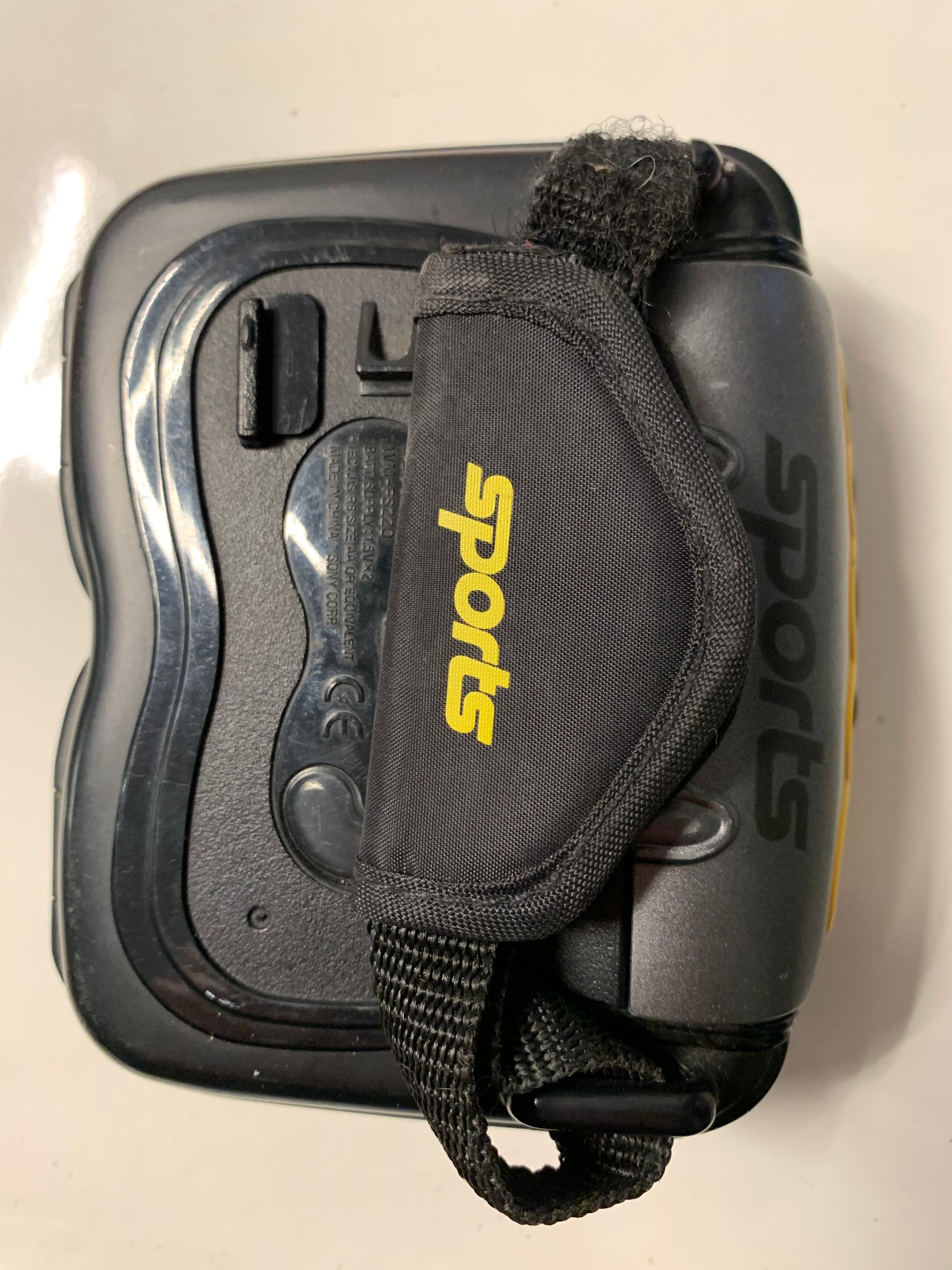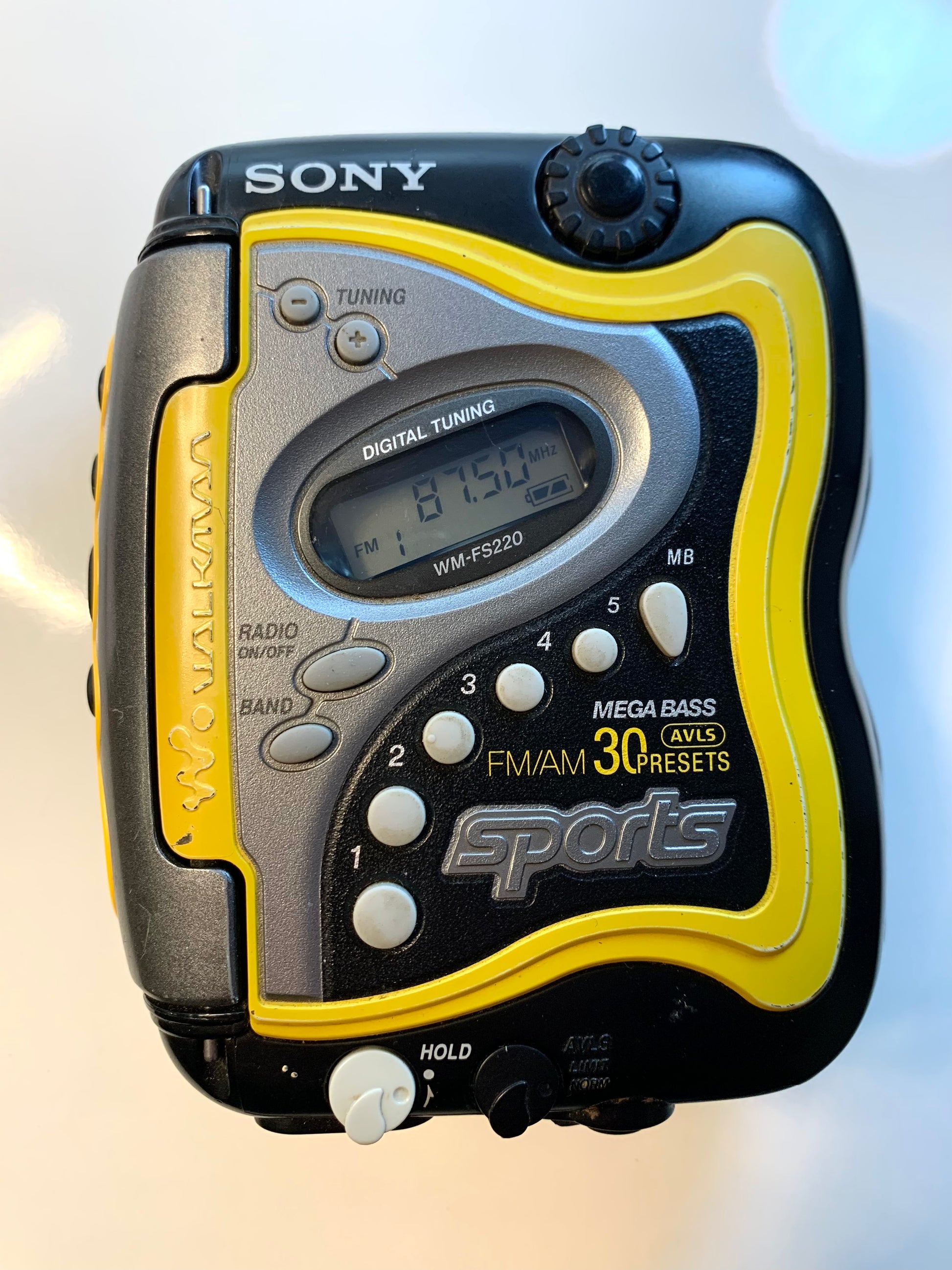 Sony Sports Cassette Walkman. FM/AM radio with 30 presets. Digital display. Sports hand strap. Missing the belt clip. Does not come with headphones. Everything functions and sounds great.